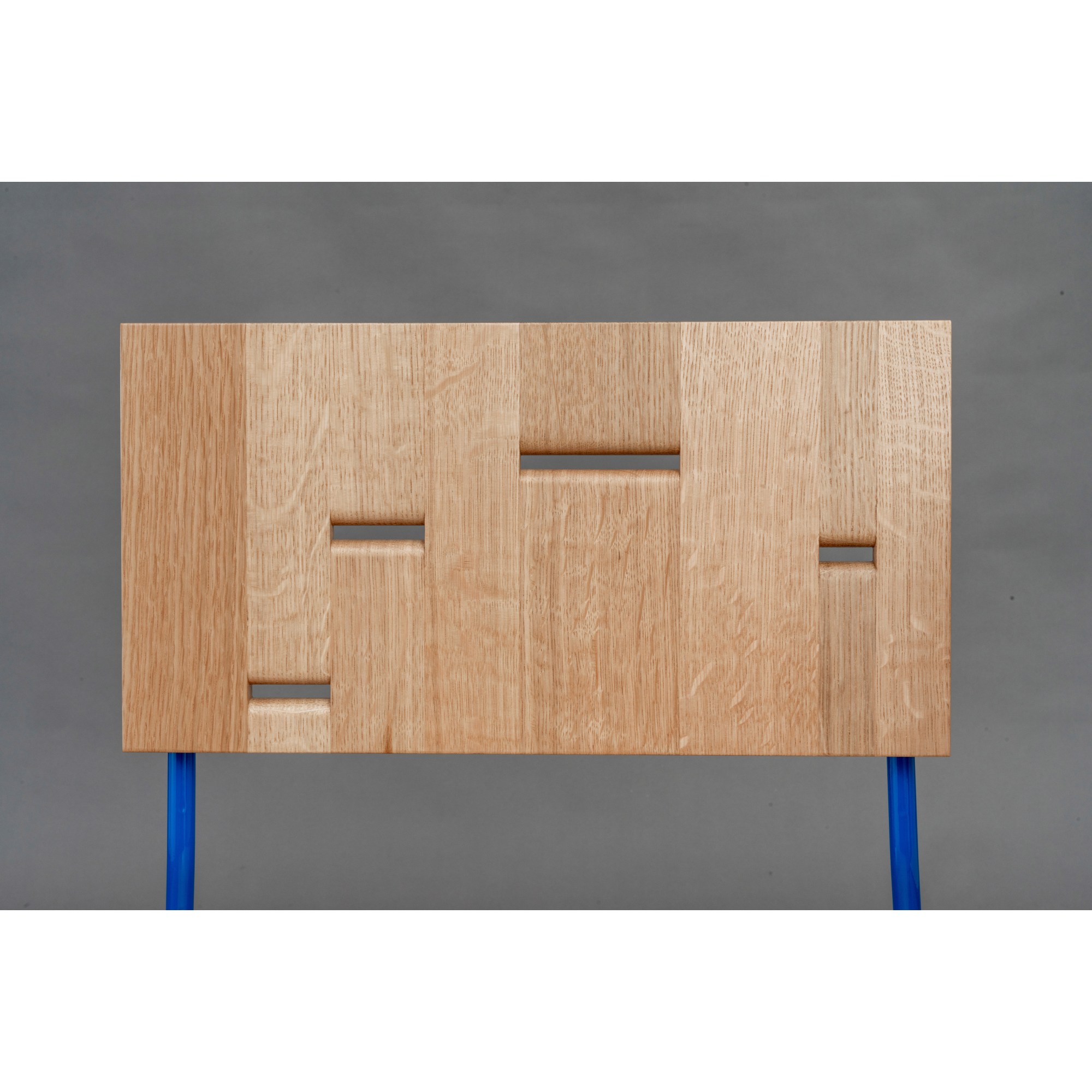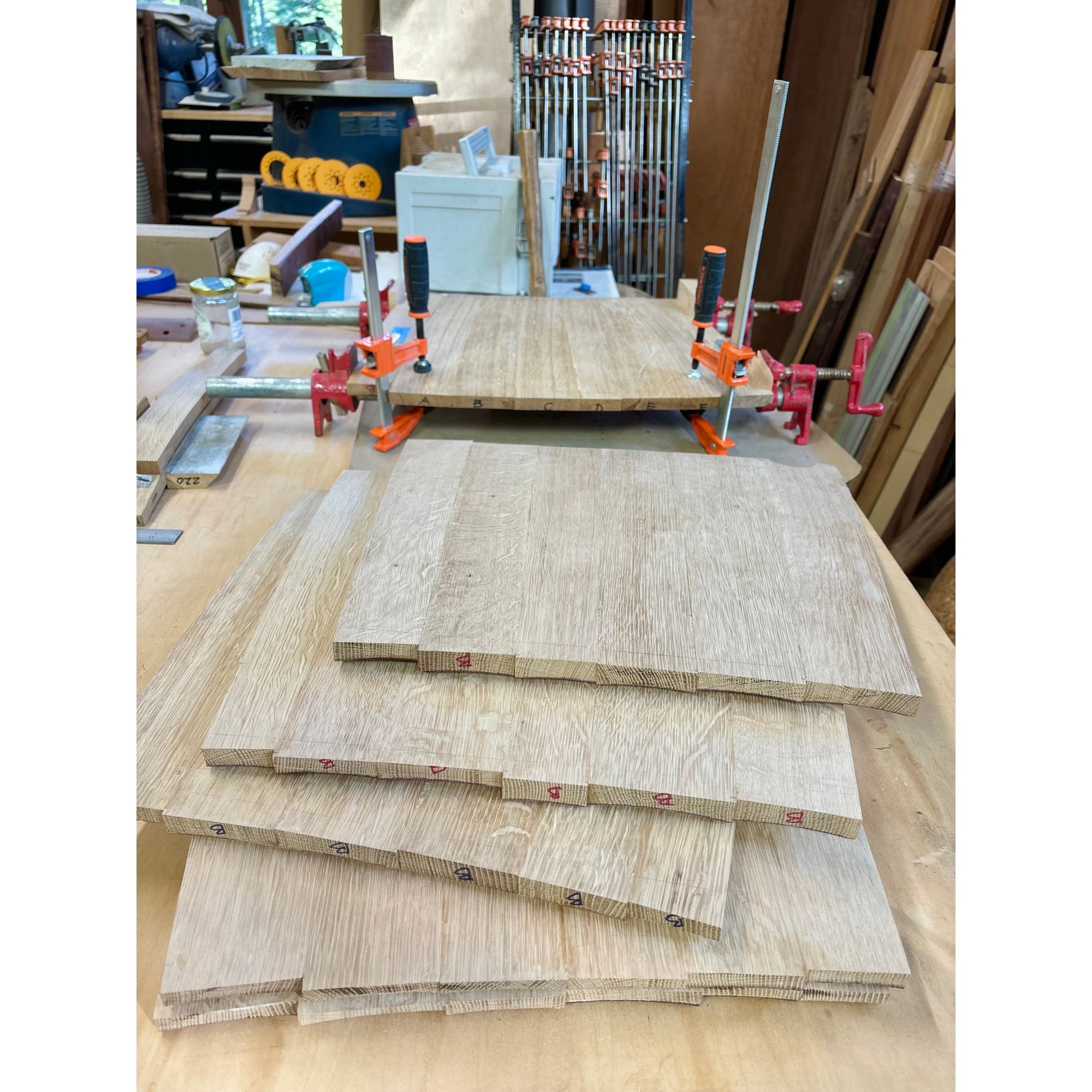 The gentle curve of the seating follows that of the original barrel. The random selection of grain pattern and trapezoidal shapes were also defined by the existing material. I was able to process a straight board to a decent thickness, proportioning a minimal back. It has been a joy to produce a piece so guided by chance.