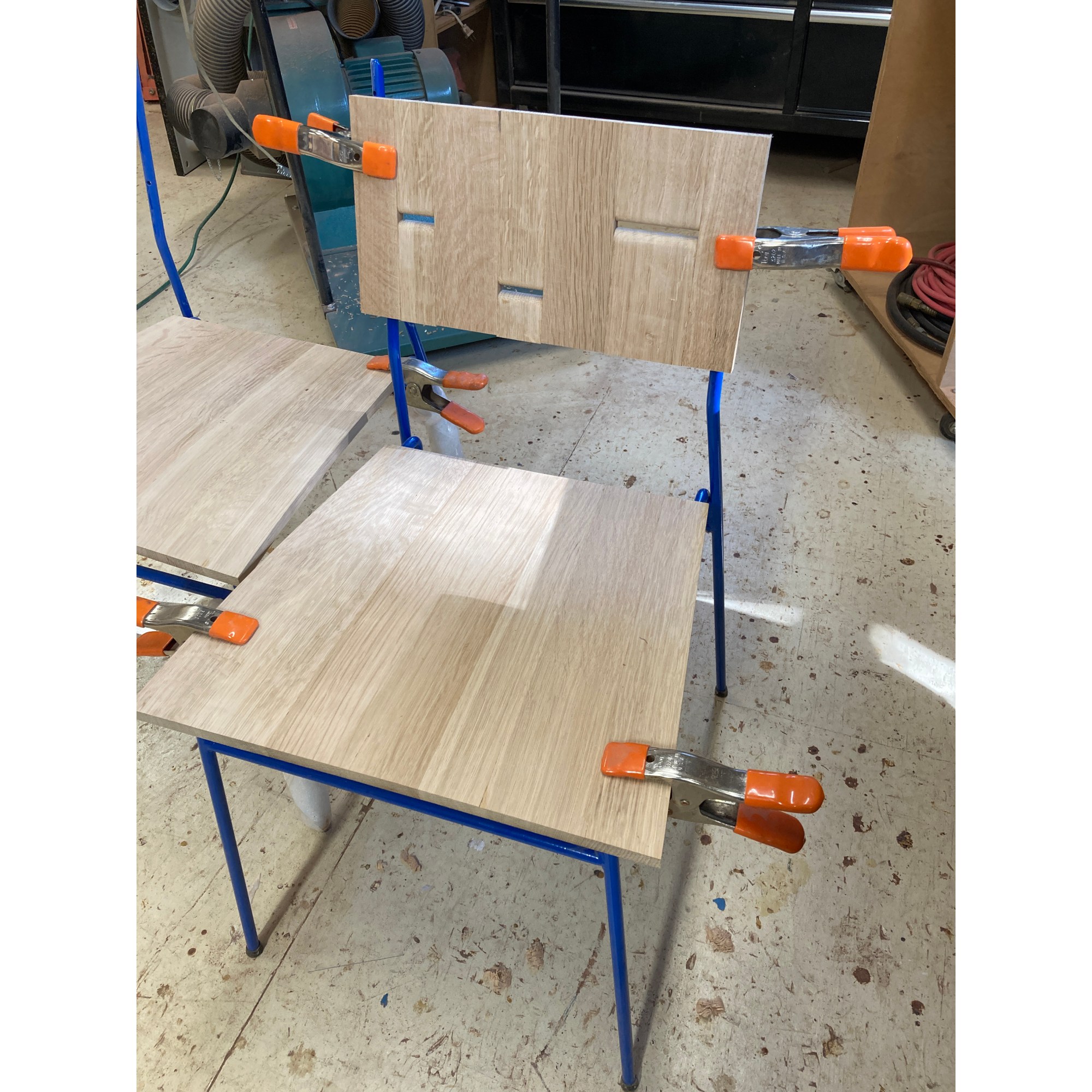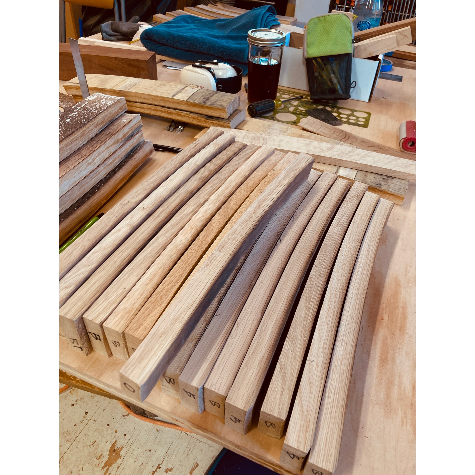 These chairs were purely an organic process. At the start of replacing the seat and back on very defunk’d 1950’s chair frames, I rescued a 1/2 wine barrel from a beloved local winery intended for a planter. I was astounded by the beauty of the French Oak and in an instant decided to morph the barrel staves into the chair project. It landed completely into my Yard Sale Series.
