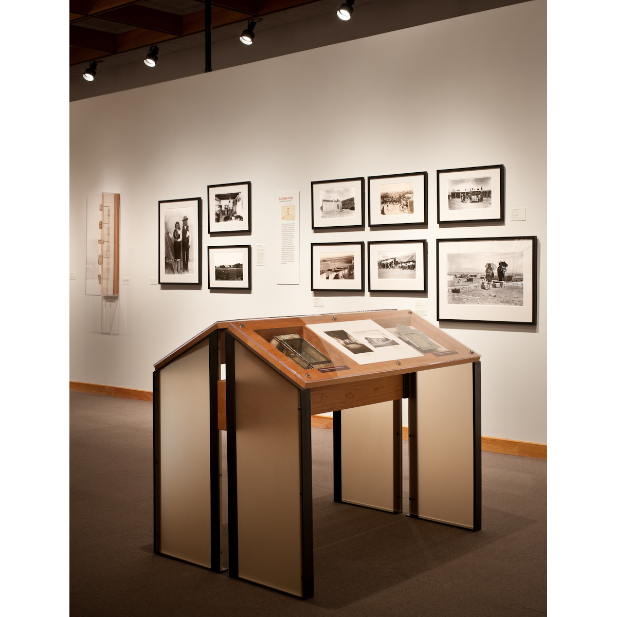 The design of the museum casework grew from a desire to allow the visitor an experience with photography at the scale of furniture which is intimate and inviting. The interplay of materials, the cherry hardwood, the translucency of resin panels anchored to thin steel frames, reflect the tone of the natural color in the pueblo environment.