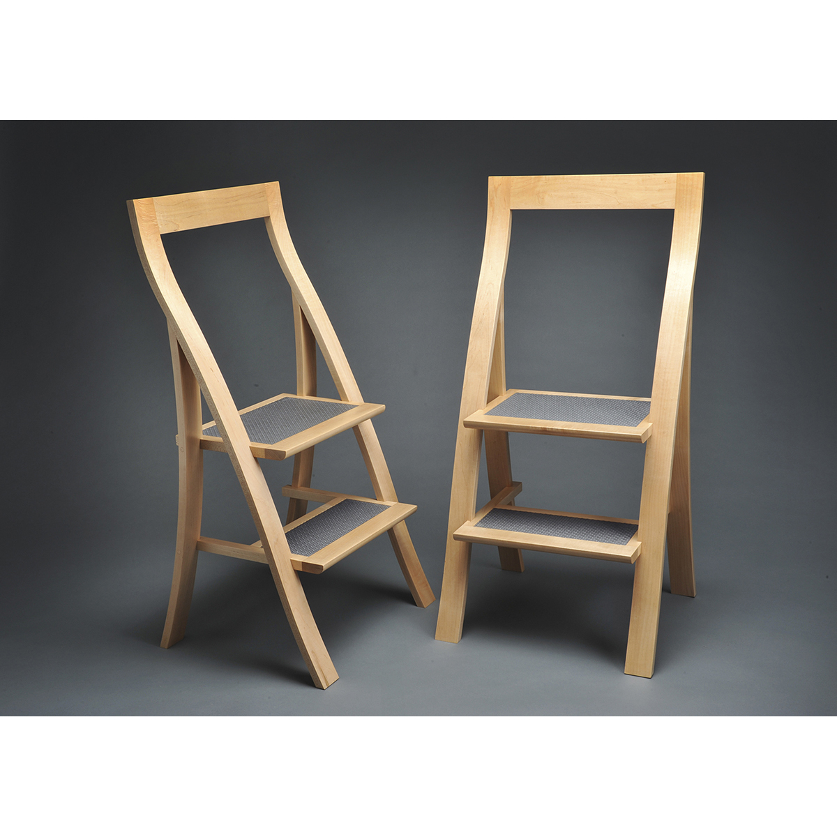 The design of WISHBONE step-stool represents the challenge of making curved forms functional. Combining a bent-laminated solid wood frame and textured treads to insure a non-slip surface, the step-stool’s sinuous curves are reminiscent of a wishbone with its smooth fluid surfaces joining at the top with a strong hold.